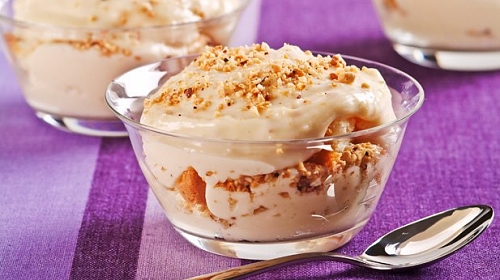 Distribua em 6 taças camadas do creme, de pedaços do bolo e da castanha. Alterne as camadas, finalizando com a castanha triturada (xerém). Leve à geladeira até servir.